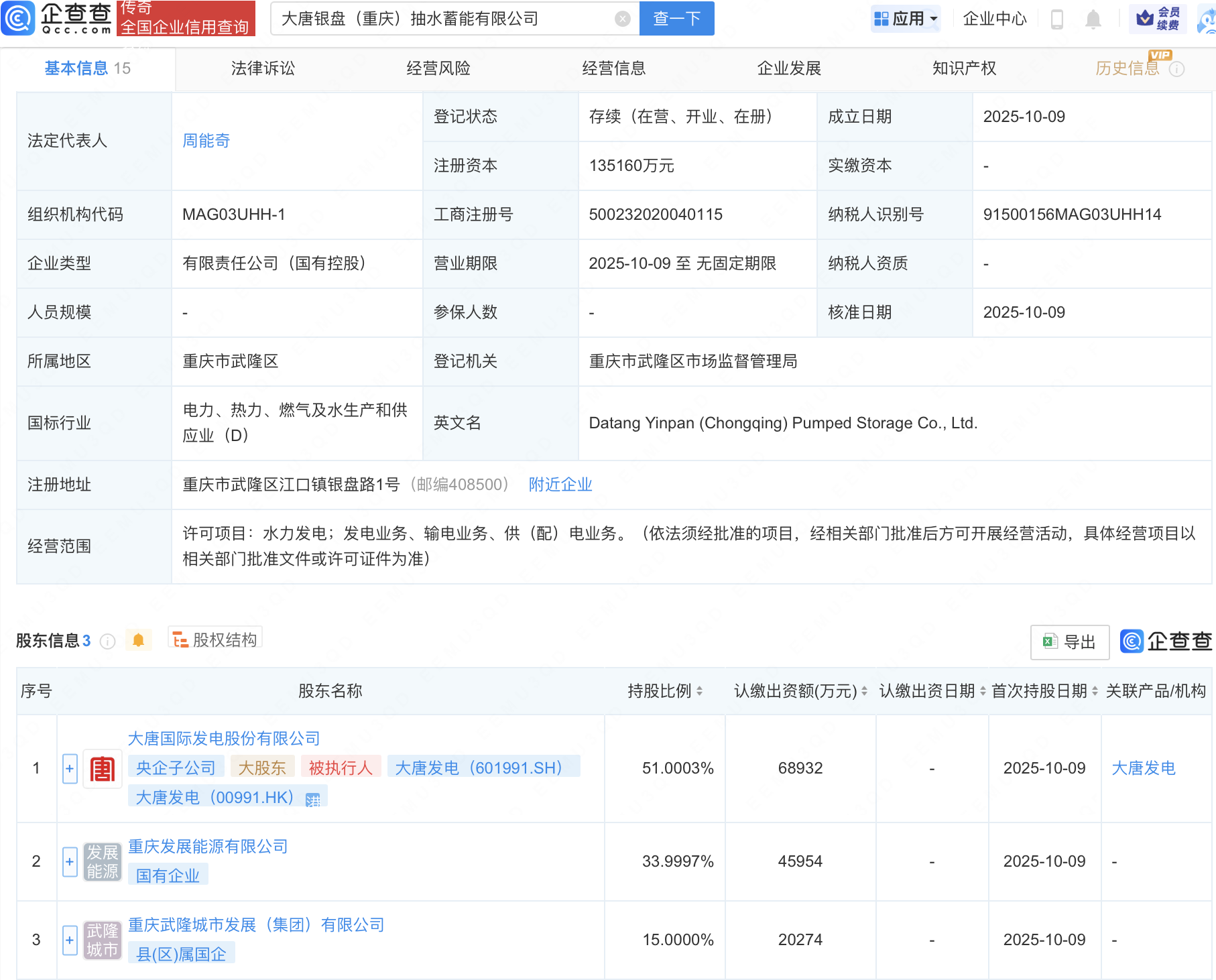 近日,大唐银盘(重庆)抽水蓄能有限公司成立,注册资本约13.52亿元,经营范围包含:水力发电;发电业务、输电业务、供(配)电业务。企查查股权穿透显示,该公司由大唐发电(601991)等共同持股。