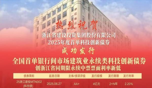 近日,恒丰银行助力全国首单银行间市场建筑业永续类科技创新债券完成发行。本期债券为浙江省建设投资集团股份有限公司2025年度第二期科技创新债券,发行规模4亿元,发行期限2+N年,票面利率2.2%,创下浙江省同品种同期限永续中票票面利率历史新低。作为本期债券的联席主承销商,恒丰银行承销金额1亿元。