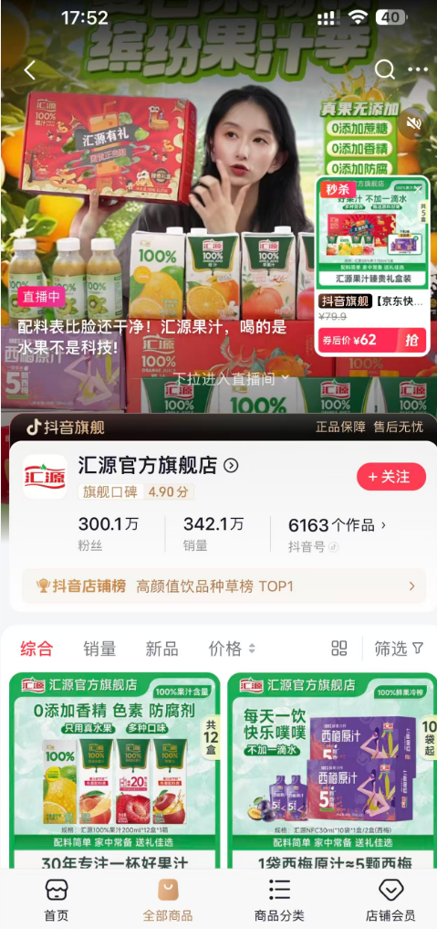 截至发稿,抖音平台上,汇源官方旗舰店的商品均显示可正常下单,店铺正进行直播。其他的汇源经销商渠道店铺,暂未发现缺货、无法下单的情况。